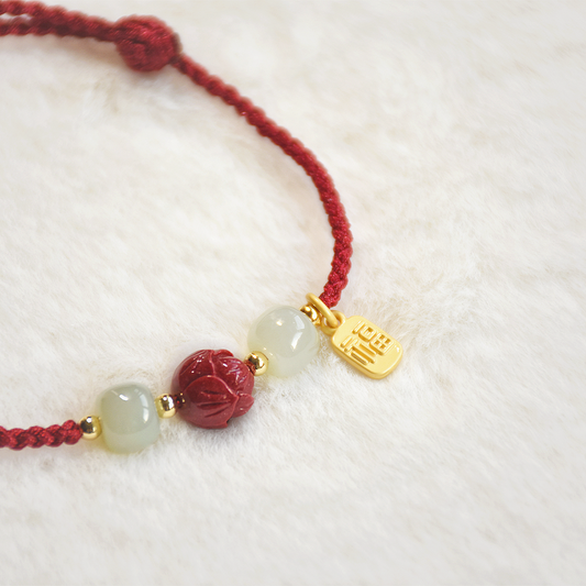 Cinnabar Lotus and Hetian Jade Auspicious Red String Bracelet